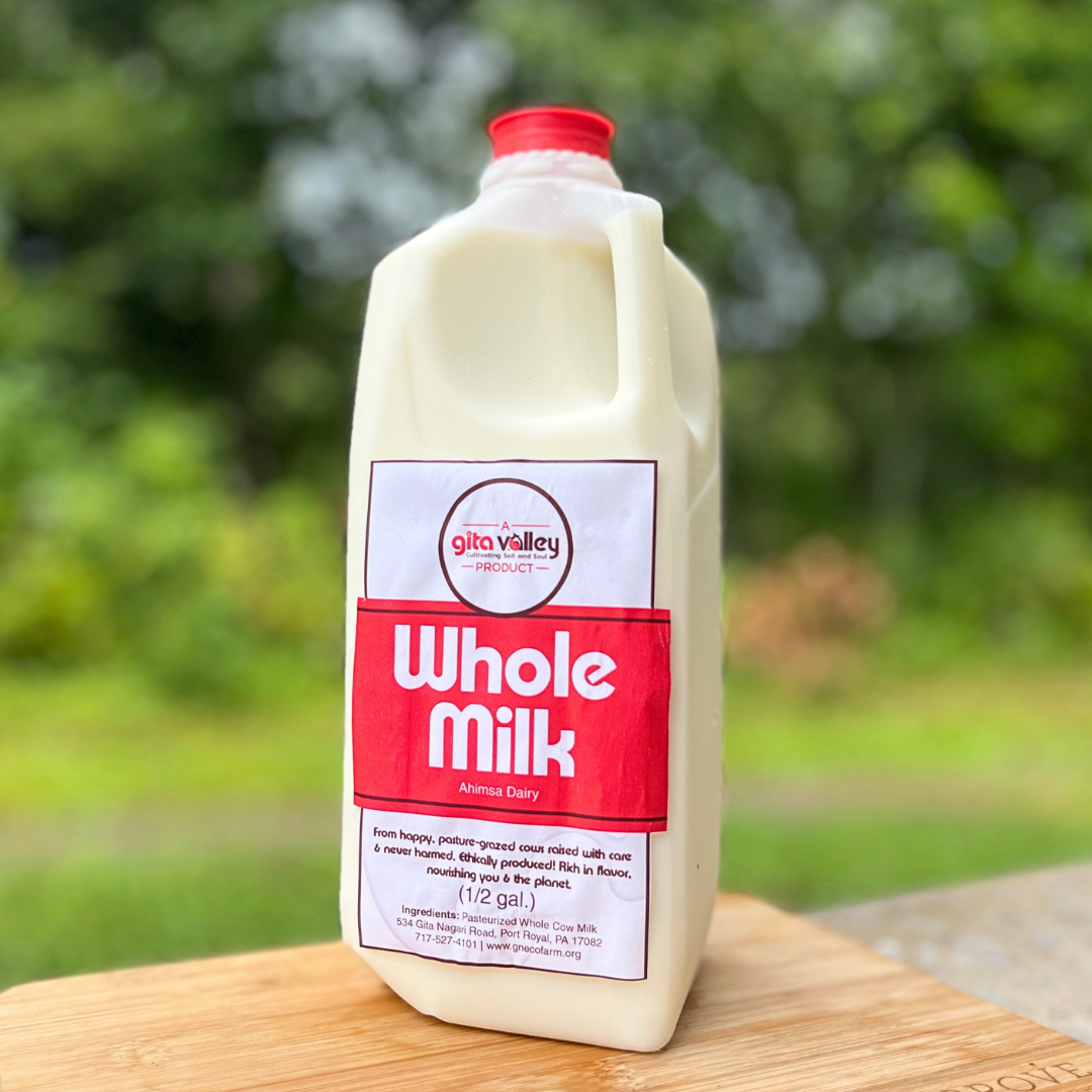 Whole pasteurized ahimsa milk from our Gita Nagari cows.